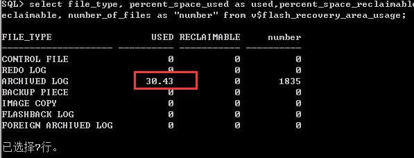 sqlplus / as sysdba startup mount //如果你的数据库出现了无法连接的情况时,可以加上这句 select file_type, percent_space_used as used,percent_space_reclaimable as reclaimable, number_of_files as "number" from v$flash_recovery_area_usage;